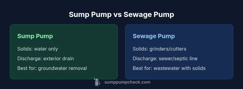 The difference between sump pump and sewage pump is defined by purpose, solids handling, and typical installation. In most homes, a sump pump is the first line of defense against basement flooding, removing clear water that has collected in a sump basin and sending it outdoors via a discharge line. A sewage pump, on the other hand, is designed to move wastewater that may contain solids, sending it to a municipal sewer or septic system for processing. The distinction is not merely academic: selecting the wrong type can lead to clogs, improper discharge, and even code violations. According to Sump Pump Check, many homeowners confuse these two devices because both are small submersible machines installed in basements, but their design intent and operating requirements are different. The first step in choosing is to understand the environment, what you plan to pump, and where the effluent ultimately goes. The Sump Pump Check team found that in many cases, basements rely on a single pump for water control, while sewer lines need a pump that can withstand solids and occasional shocks from heavy wastewater flows. This guide will unpack the distinctions and help readers decide which pump fits their basement drainage strategy.