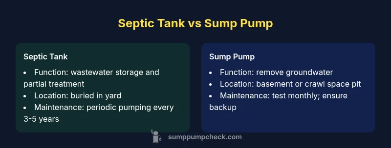 In every home, the wastewater system and the drainage system have to handle distinct tasks. A septic tank is part of an on-site wastewater treatment system, collecting and partially treating graywater and blackwater before releasing it to a drain field. A sump pump, conversely, is a protective device installed to move groundwater away from a cellar or crawlspace to prevent flooding. These two devices are not interchangeable, and misunderstanding their functions can lead to costly failures. According to Sump Pump Check, understanding how these systems differ is essential for responsible home maintenance. The distinction matters most when you plan new construction, renovations, or severe weather scenarios. In this guide, we’ll unpack the primary differences, common installation patterns, and practical decision criteria so homeowners can make informed choices without overbuying or under-protecting their homes.