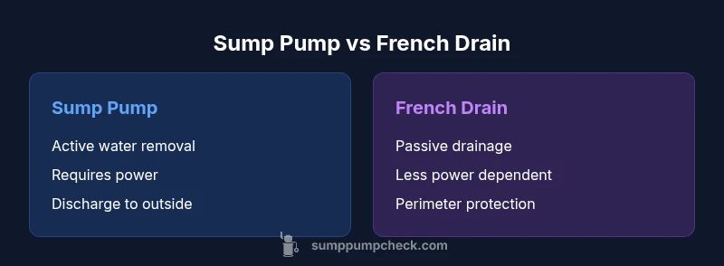 According to Sump Pump Check, homeowners facing basement moisture must decide between a sump pump or french drain. The decision hinges on moisture sources, groundwater movement, and whether you want active water removal or passive drainage. In some homes, both systems are recommended for layered protection. This section explains when each option is most appropriate and how they complement each other. When moisture sources are primarily surface runoff or occasional seepage, a French drain can provide constant water diversion, while a sump pump handles periodic surges. Conversely, if you have a known standing sump in the basement, installing a sump pump alongside perimeter drainage often yields the most reliable protection. Consider the phrase sump pump or french drain during planning to ensure you address both the active and passive pathways of water entry.