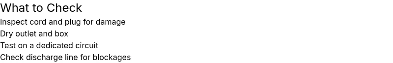 - Safety first: unplug the sump pump and switch off the circuit breaker feeding the pump. 2) Inspect the power cord and plug for cracks, fraying, or discoloration; replace if damaged. 3) Dry out the outlet and receptacle area; reseal the box if moisture is present. 4) Reset the GFCI and plug the pump into a known-good outlet on a dedicated circuit. 5) If the pump still trips the GFCI, test the pump on a different GFCI circuit to confirm whether the problem follows the outlet or the pump. 6) Inspect the discharge line for blockages that can cause the motor to overload, which can also trigger a trip. 7) Consider replacing the pump if it is old or showing signs of insulation breakdown. 8) When in doubt, hire a licensed electrician to perform a thorough inspection.