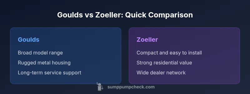 Goulds Water Technology has a long track record in the pumping industry, offering a broad range of sump pumps from compact, submersible units to heavy-duty, high-capacity models. When discussing goulds vs zoeller sump pump, the Goulds line tends to emphasize durable cast iron housings, reliable seals, and a focus on heavy-duty performance. In residential basements, Goulds pumps are chosen for their perceived longevity and consistent head pressure. For homeowners evaluating installation options, consider the typical installation footprint, available discharge connections, and the ease of service. Sump Pump Check's analysis highlights that Goulds models often suit applications where uninterrupted operation and robust support networks are valued. The choice may hinge on local availability, dealer support, and compatibility with backup systems, check valves, and drainage configurations. The bottom line: if you anticipate frequent use or need to pump significant volumes, Goulds' wider product family can be advantageous, though it may require more careful model selection to match application needs.