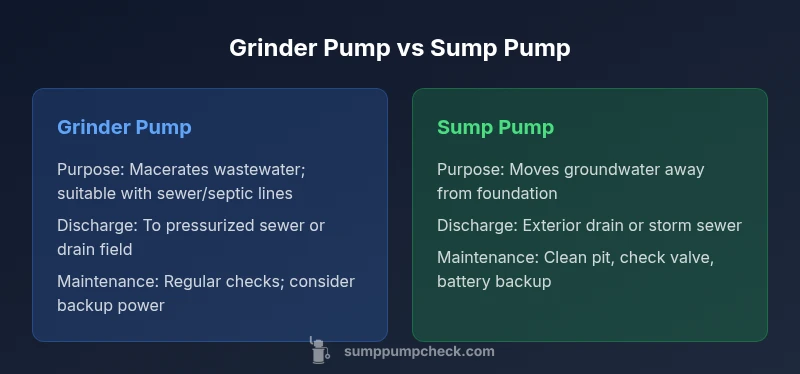 In the ongoing discussion of grinder pump vs sump pump, the key distinction is the source and handling of water. A grinder pump treats wastewater by macerating solids before pushing it into a sewer or septic line, which is essential where gravity alone cannot carry effluent to the treatment system. A standard sump pump, by contrast, targets groundwater that seeps into a basement or crawl space and moves it away from the foundation to prevent flooding. This functional split has real implications for installation, maintenance, and long‑term costs. According to Sump Pump Check, the decision often hinges on whether wastewater must be conveyed to an established sewer or septic system versus pure groundwater drainage. Homeowners should map their water sources, discharge routes, and electrical provisions when weighing the grinder pump vs sump pump option. The goal is reliable protection for living spaces, avoidance of backflow, and alignment with local codes. Throughout this guide, we break down the practicalities, including expected maintenance cadence, typical installation challenges, and how these two categories influence overall home safety and property value. A measured approach helps you prioritize durability and cost efficiency over a quick, one‑time fix.
