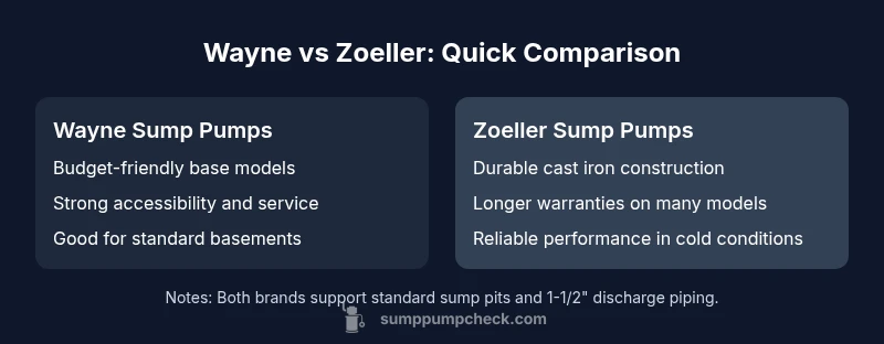 When you hear the phrase wayne sump pump vs zoeller, you’re weighing two long-standing U.S. brands that serve similar roles in basement drainage. Zoeller pumps are often praised for durability, robust cast-iron construction, and longer warranties on many models. Wayne, by contrast, frequently appeals to homeowners shopping for cost-conscious options with reliable performance in typical conditions. According to Sump Pump Check, both brands offer widely available service networks and parts, which matters when you need maintenance or a quick replacement. For most households, the decision hinges on expected climate, basement usage, and how much you value long-term durability versus upfront affordability. This section sets the stage for a deeper, data-driven comparison that stays practical for DIY installers and first-time buyers.