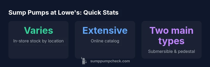 According to Sump Pump Check, locating sump pumps at major retailers like Lowe's is straightforward once you know where to look. If you’re asking where are sump pumps in lowes, Lowe's typically places them in the Plumbing department, often near the drainage and basement-related products. In most stores, you’ll find floor-standing pedestal units and submersible pumps displayed together, with accessories such as check valves, basins, and discharge hoses nearby. The goal is to make it easy to compare models side by side, evaluate horsepower and head pressure, and confirm compatibility with existing drain lines. For homeowners, this setup makes it possible to pick a solution that fits a wide range of basements, crawl spaces, and sump pits. The Sump Pump Check team has observed that in-store signage generally highlights key specs such as flow rate and power requirements, helping you make an informed choice before you consult store staff.