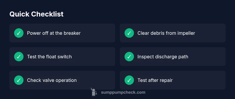 Start with the simplest checks and progressively tackle more complex ones. Step 1: confirm power is off at the breaker and label the circuit. Step 2: inspect for debris around the impeller and remove any obstructions. Step 3: test the float switch by gently lifting and lowering it to see if it engages the motor properly. Step 4: examine electrical connections for looseness or corrosion. Step 5: if the impeller and float seem fine, test or replace the capacitor or relay as needed. Step 6: reassemble and power on to observe if the buzzing persists. This flow minimizes risk and helps you decide whether the fault is electrical, mechanical, or both.