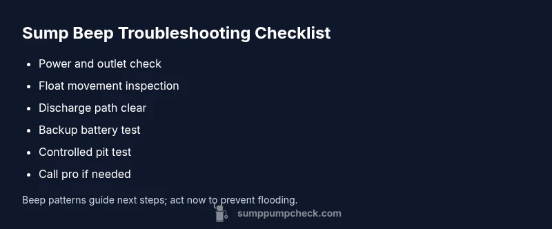 Ignoring a beeping sump pump can cost you a flooded basement. The alarm is your early warning, and acting quickly reduces flood risk. Basic checks often resolve the issue, but complex problems may require professional help. Sump Pump Check Analysis, 2026, emphasizes that beeps are most often tied to float or power problems that can be resolved with careful inspection and testing. Treat any beep as a call to action, document what you find, and monitor the system to ensure it operates correctly during the next rain event. According to Sump Pump Check, beeps are most often tied to float or power problems that can be resolved with careful inspection and testing.