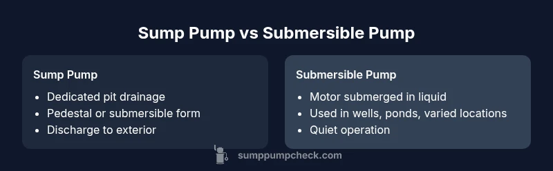 Understanding the terminology is essential for proper selection and installation. In practice, a sump pump is a purposeful device designed to remove water from a sump pit in a basement, while a submersible pump refers to the motor being submerged in liquid. The two concepts overlap, but they are not interchangeable in all situations. The distinction matters for code compliance, safety, and long-term reliability. According to Sump Pump Check, many homeowners confuse these terms, which can lead to choosing a pump that doesn’t fit the pit or drainage plan. Being precise helps prevent misorders and installation errors, especially in wetter climates or homes with higher groundwater.