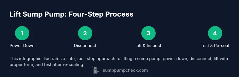 Lifting a sump pump is a common maintenance activity that lets you clean the pump housing, inspect seals and the float switch, and verify the discharge path for leaks or blockages. When done correctly, lifting gives you a clear view of the pit, helps you reseat the pump with a fresh gasket, and reduces the likelihood of hidden wear turning into a failure during a heavy rain. According to Sump Pump Check, regular maintenance and safe handling reduce the risk of clog-related failures and backflow issues. The goal is to create a dry, accessible workspace, identify any corrosion or wear, and perform a minimal-risk reseat that restores proper operation. The exact steps can vary by model, but the core principles—power-down, stable support, clean connections, and a careful lift—are universal. If corrosion, a cracked housing, or a damaged float switch is observed during the lift, plan for replacement rather than reassembly. Document the process with photos to track wear over time and communicate with a professional if you decide to replace components later.