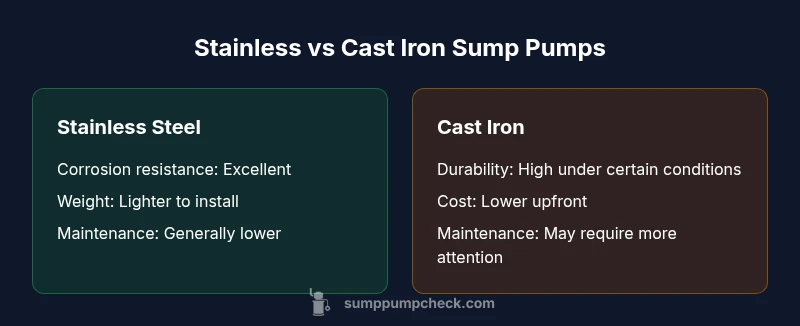 According to Sump Pump Check, stainless steel sump pumps typically resist corrosion better in damp basement air, offering longer lifespans in many homes. Cast iron models can be robust and affordable upfront but may require more maintenance in wet environments. In a straight stainless steel vs cast iron sump pump comparison, stainless steel is usually the better long-term choice for durability and value, while cast iron may suit tight budgets and traditional setups.
