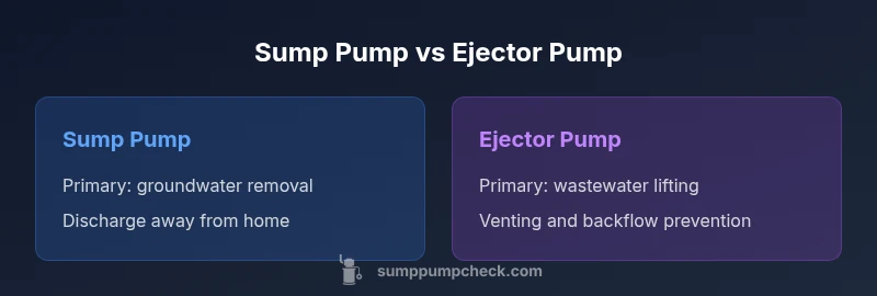 In many homes, two distinct pump systems exist to manage water and waste: the sump pump and the ejector pump. The sump pump is typically installed in a basin or pit at the lowest point of a basement or crawl space and is designed to remove groundwater that collects around the foundation. The ejector pump, by contrast, sits in a dedicated ejector pit and handles wastewater lifted from fixtures such as toilets, sinks, and washers to the home’s sewer or septic line. When considering a combined sump pump and ejector pump setup, homeowners must evaluate water sources, discharge routes, venting, and local codes. The Sump Pump Check team emphasizes that mixing these roles can lead to inefficient operation or code violations if not properly designed. Understanding the distinct purposes helps homeowners plan maintenance, future upgrades, and backup options more effectively.