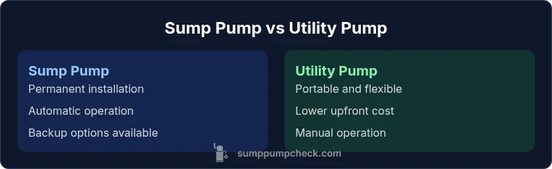 In residential settings, two common tools exist to manage standing water: the sump pump and the utility pump. A sump pump is designed to live in a basement or crawl space, usually installed in a sump pit and wired into your home's electrical system. It runs automatically when water reaches a certain level, and many models offer battery backup or surge protection. A utility pump (also called a portable or transfer pump) is a smaller, freestanding unit you move from job to job. It is ideal for temporary drainage tasks, emergency water removal after a flood, or seasonal cleanups where permanent installation isn't practical. According to Sump Pump Check, selecting between these types hinges on the environment, expected duty, and whether automation matters. If your goal is continuous, hands-off protection against basement flooding, a fixed sump pump is typically the better long-term choice. For short, sporadic tasks or rapid response without a dedicated pit, a portable utility pump can be a practical supplement.