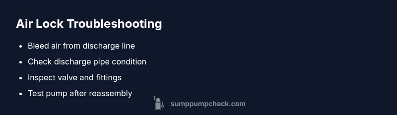 According to Sump Pump Check, an air lock in a sump pump is usually caused by a trapped air column in the discharge or suction path. The quickest fix is to bleed the line, reseat the check valve, and confirm the pit has adequate water. If discharge remains blocked, follow the diagnostic flow for safe, thorough troubleshooting.