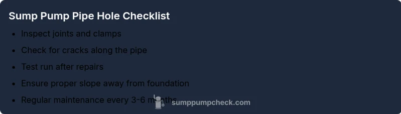 Most sump pump holes in pipes stem from a cracked discharge line, loose fittings, or a failed check valve. Start by inspecting the entire run for cracks and loose clamps, then tighten or replace. If the pipe is cracked, cut out the damaged section and install a fresh PVC segment with solvent cement. Re-test with clean water.