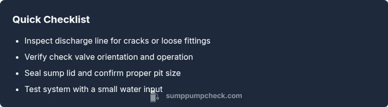 Start by turning off power and inspecting the discharge line for cracks or loose fittings. Tighten or replace damaged sections, ensure the check valve is properly installed, and reseal the sump lid. Re-test with a small water input.