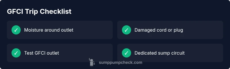 If your sump pump is tripping the GFCI, you're not alone. According to Sump Pump Check, a GFCI-protected setup trips to protect you from electric shock when moisture or faults are detected in the pump. The most common drivers are ground faults caused by water contact with electrical components, a damaged power cord, or a compromised outlet. Understanding these triggers helps you prioritize checks quickly and safely. In basements, where humidity and damp conditions are common, the risk of moisture intrusion into the electrical connection rises. Before you start, ensure you have dry hands and a dry work area, and never work on energized components. With careful inspection, you can usually identify the culprit in a few simple steps. In many cases, the problem is not the pump itself but the environment around the pump—the outlet, the cord, and the pit area.
