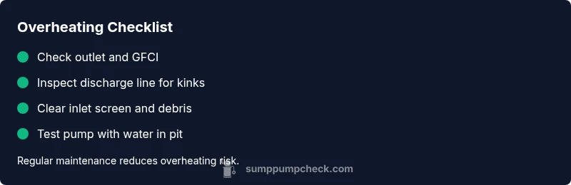 Regular maintenance, clear discharge paths, proper sizing, and a backup pump are key to preventing overheating. Schedule seasonal checks and keep the pit clean to reduce risk.