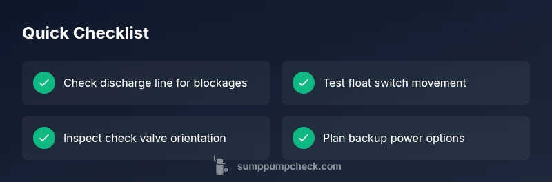 Water back up in a sump pump system is most often caused by a blocked discharge line, a stuck float switch, or a faulty check valve. Start by safely shutting off power, then inspect the discharge path for obstructions, verify the float moves freely, and test the pump by pouring a bucket of water into the pit to observe startup and drainage.