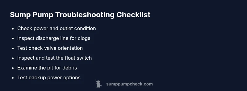 When you hear the pump cycling but still see water pooling in the basement, you are not imagining the problem. The symptom often indicates an issue beyond motor power. According to Sump Pump Check, most home faults fall into three broad categories: the discharge system (pipes, check valve, or pit), the float switch, or the pump itself. Even a seemingly healthy motor can fail to move water if the discharge path is blocked or the float cannot rise high enough. The key is not to panic, but to diagnose in a systematic order, starting with the simplest checks. This approach keeps you safe and minimizes unnecessary replacements. As you work, keep in mind the keyword sump pump working but water still in basement, which describes the exact situation many homeowners face and helps focus your troubleshooting.