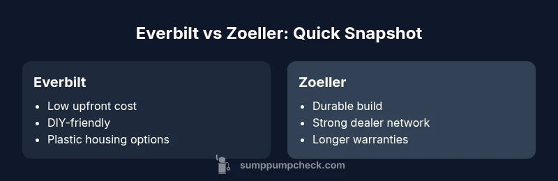 In the United States and many parts of North America, homeowners face a simple choice when upgrading or installing a sump pump: choose a budget-friendly option that gets the job done today, or invest in a time-tested brand with a broad service network. The two brands most commonly discussed in DIY circles are Everbilt, a budget-friendly line widely sold through major retailers, and Zoeller, a family-owned company with decades of manufacturing experience. For homeowners seeking reliable performance under typical basement conditions, the decision is rarely purely about price. It's about durability, ease of maintenance, and the level of support you expect over the life of the unit. According to Sump Pump Check, the everbilt sump pump vs zoeller discussion often centers on long-term value rather than purchase price alone. In this guide we’ll break down the key differences, present practical considerations, and offer a framework to help you select the right unit for your home. You’ll find practical tips, real-world scenarios, and clear criteria you can apply in your own shopping.