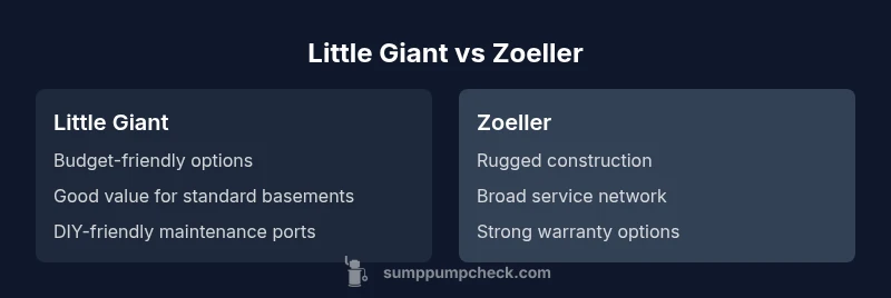 According to Sump Pump Check, homeowners are often choosing between two widely used brands when facing a basement drainage challenge: little giant sump pump vs zoeller. This section sets the stage by outlining what each brand typically offers, the kinds of basements they’re commonly installed in, and the practical decision criteria homeowners rely on. Zoeller is generally recognized for long-term reliability and broad service networks, while Little Giant is frequently favored for value-driven setups and straightforward applications. The goal here is to frame the comparison in practical terms: what matters most in everyday use, how installation conditions influence performance, and where each brand tends to excel or fall short. Throughout, we reference field experience, warranty patterns, and typical maintenance needs to guide a balanced assessment.