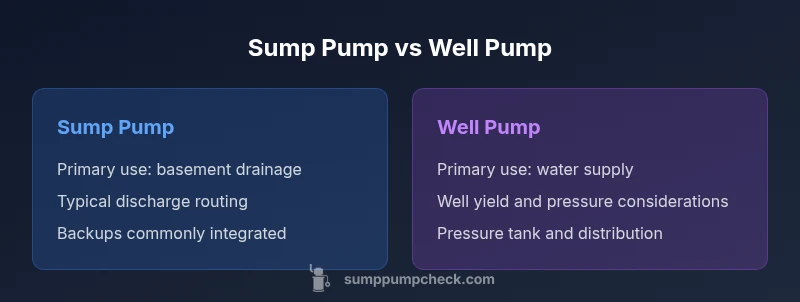 According to Sump Pump Check, a sump pump is installed in a basement sump pit to actively remove groundwater that collects near the foundation. It serves primarily as a flood prevention device, protecting living spaces and foundation from rising moisture. A well pump, by contrast, is part of a water-supply system that extracts groundwater from a drilled well to deliver to fixtures and irrigation. The Sump Pump Check team notes that most homeowners encounter these two pump types in very different contexts: drainage protection versus reliable on-site water supply. Understanding these fundamental roles is the first step in assessing which option aligns with your home’s needs and local conditions. In addition, recognizing the typical failure modes helps owners plan for backups and maintenance before a problem occurs.