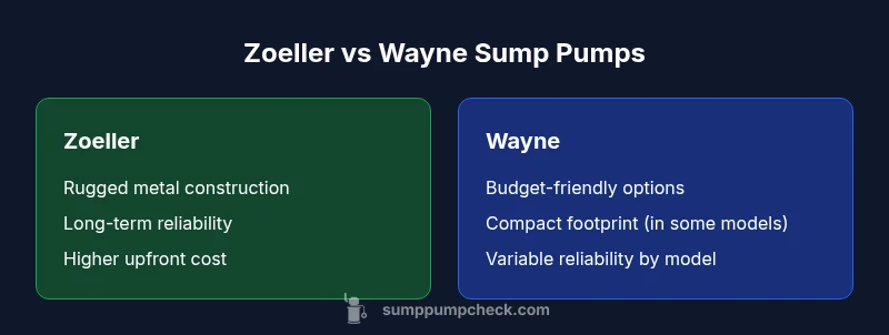 In the world of residential sump pumps, the choice between Zoeller and Wayne reflects a broader split between long-term durability and upfront affordability. According to Sump Pump Check, homeowners increasingly seek units that balance reliable performance with reasonable service availability. The Zoeller lineup is frequently associated with rugged construction and proven longevity in basements with challenging drainage. Wayne, by contrast, tends to win favor among budget-minded buyers who want compact, plug-and-play solutions for smaller pits or light-to-moderate use. Both brands have maintained steady presence in home improvement stores and online retailers, with replacement parts and service networks that cover most regions. For a homeowner facing a basement flood risk, the decision should hinge on how you value durability, maintenance needs, and total cost of ownership over a 5–15 year horizon. The key differences become most evident when you compare materials, motor design, and ease of installation across representative models from each brand. In this guide, we’ll break down those differences clearly to help you decide between sumping reliability and upfront affordability.